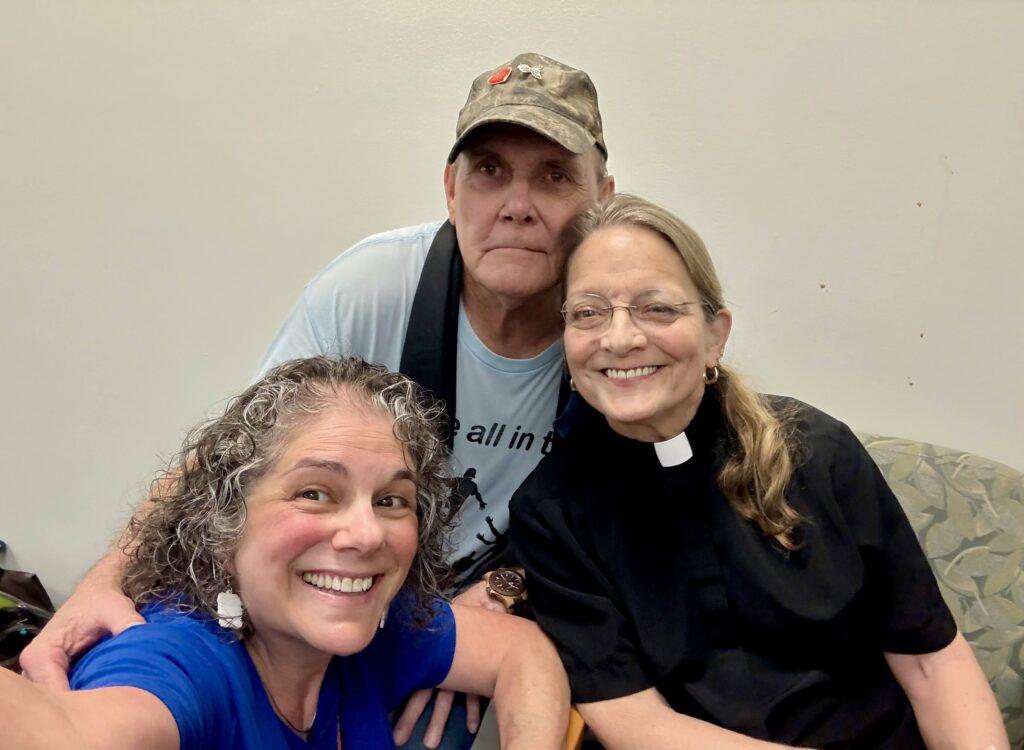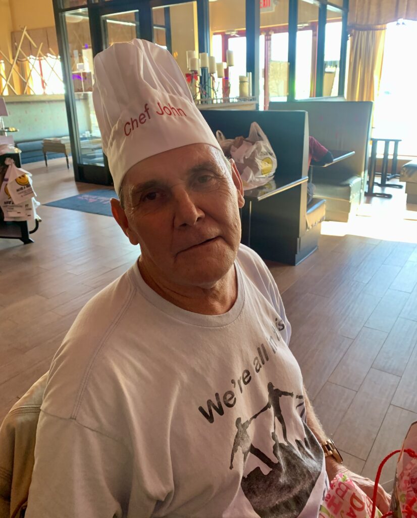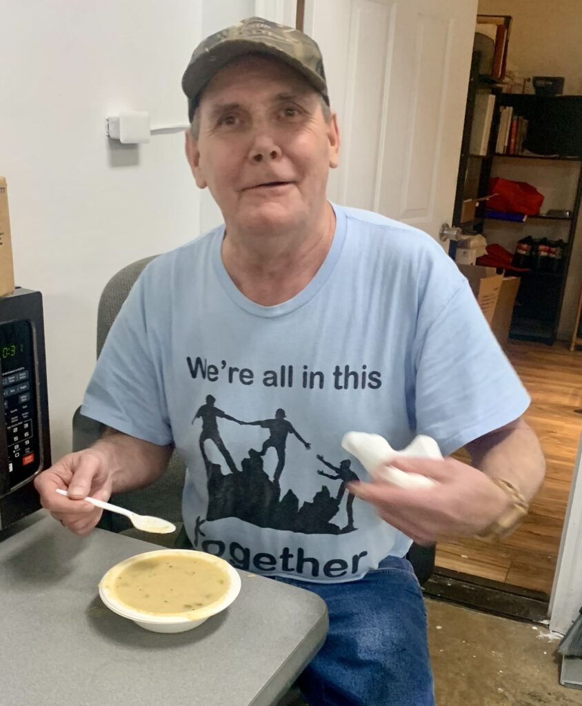 Kauffman sets up for their meetings, bingo games, and church services. After services, he also makes grilled cheese sandwiches for everyone. His volunteering role means he is often at AHOH early to open the doors at 8:30am, clean, and make coffee for everyone. He has grown especially close with leaders of Together with Hope, Father Ed Jansen and Amma Trish Gaffney, who founded the Emmaus Center Church. They are part of how he started cooking for the group. He often cooked chili for himself, and one day asked them if he could cook for the group. They said yes, and he’s been cooking for AHOH ever since, even expanding into grilling for AHOH cookouts and making other dishes like macaroni salad and tuna casserole.