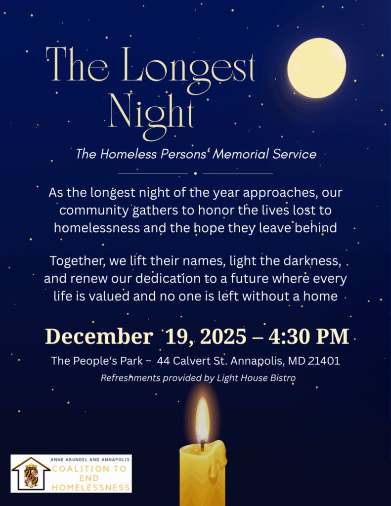 Arundel House of Hope joined members of the community alongside local officials at The People’s Park on December 19th to commemorate The Longest Night Homeless Persons’ Memorial Service. In concert with cities across the nation, we came together just before the longest night of the year, winter solstice, to honor the lives of Anne Arundel County residents that lost their lives this year while facing homelessness. Each organization involved pledged commitment and dedication to our unhoused neighbors in 2026 as one way to honor those we lost in 2025.