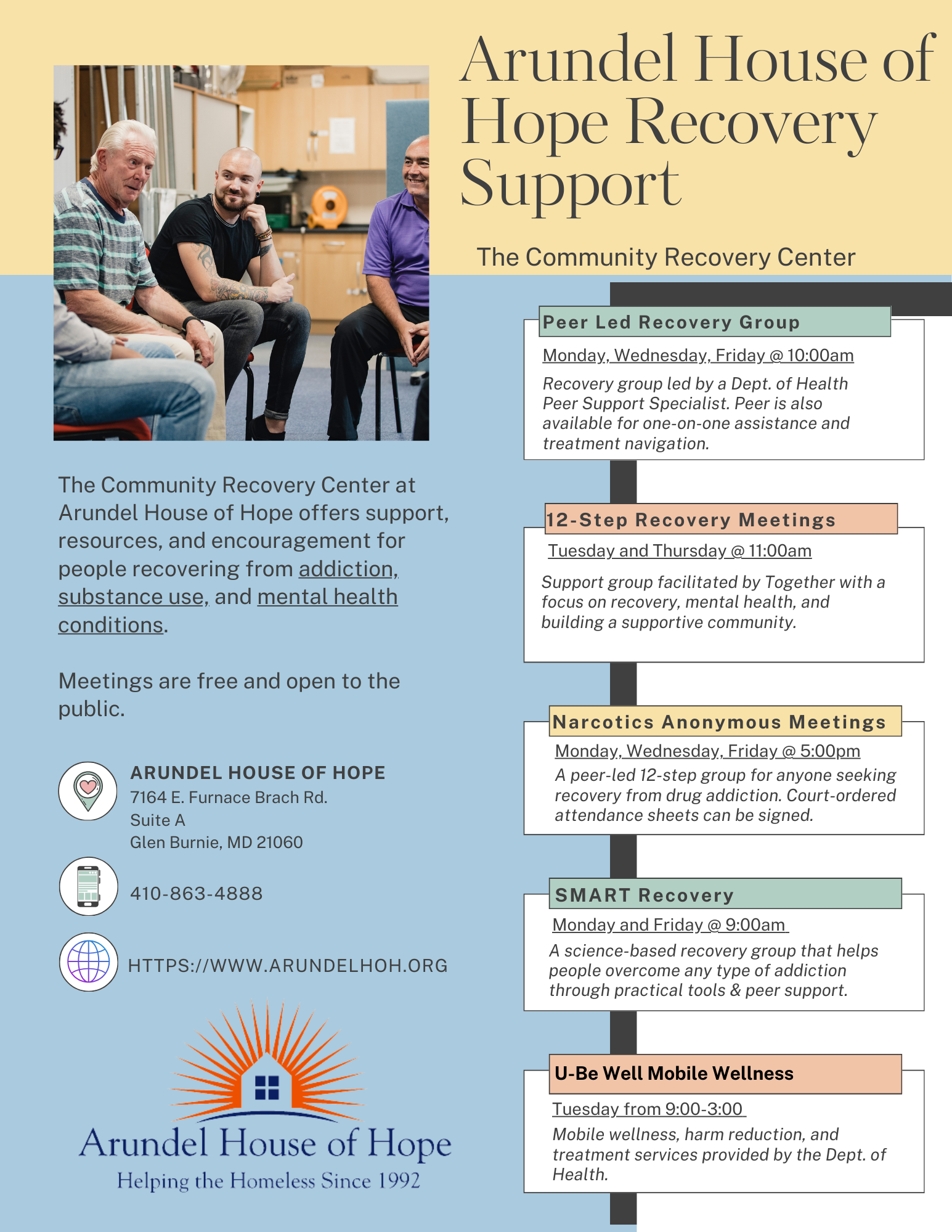 The CRC serves adults 18 years old and older. If you are interested in participating with the CRC, please stop by. All services are confidential. For more information, call 410-863-4888 or email info@arundelhoh.org.